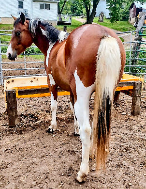 Cherokee is stocky and with a thick build. This pretty girl is homozygous for black tobiano.
