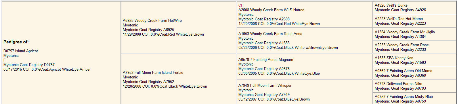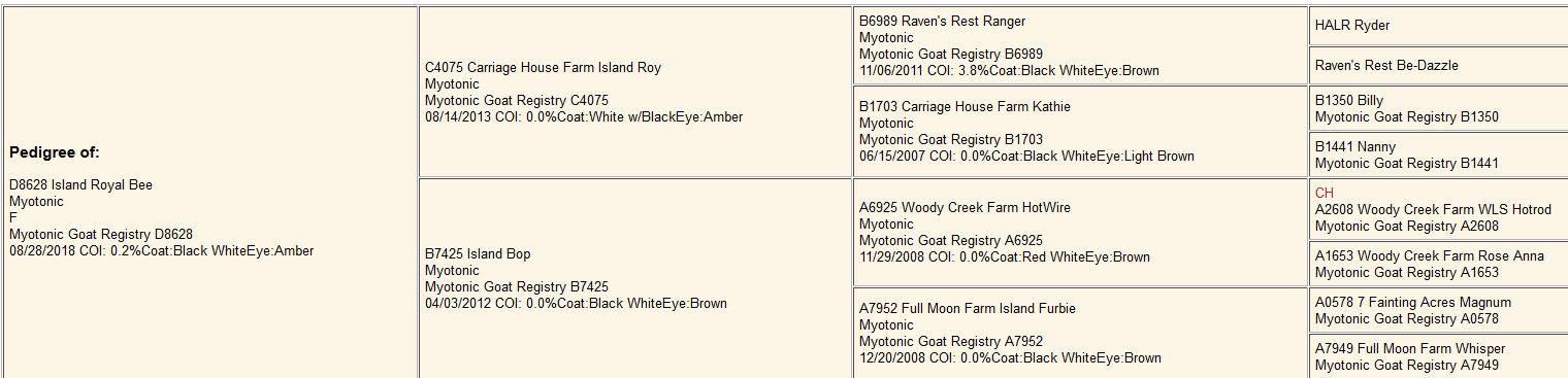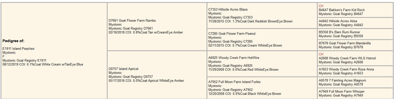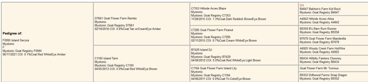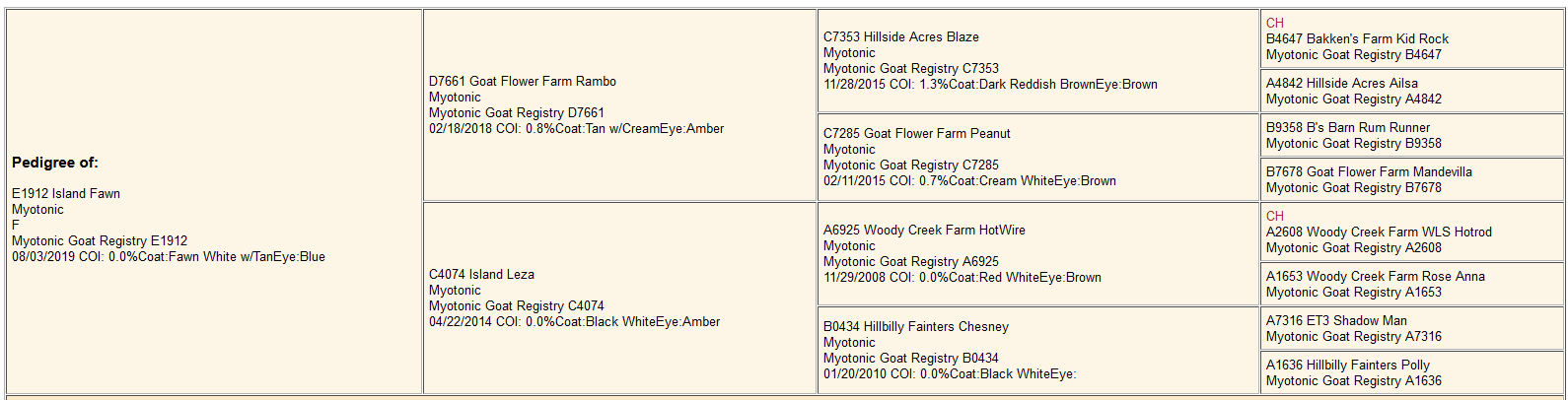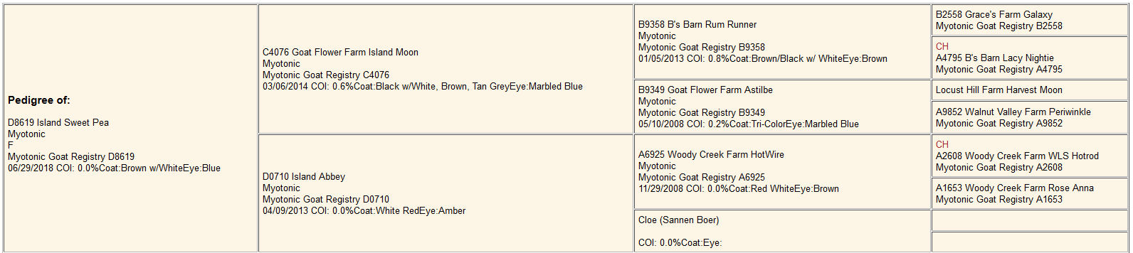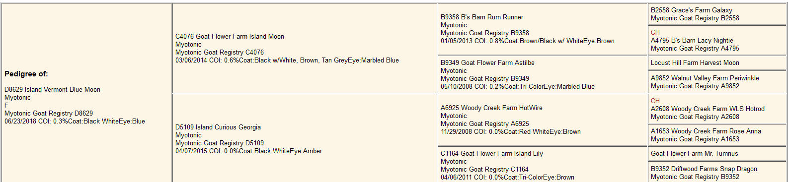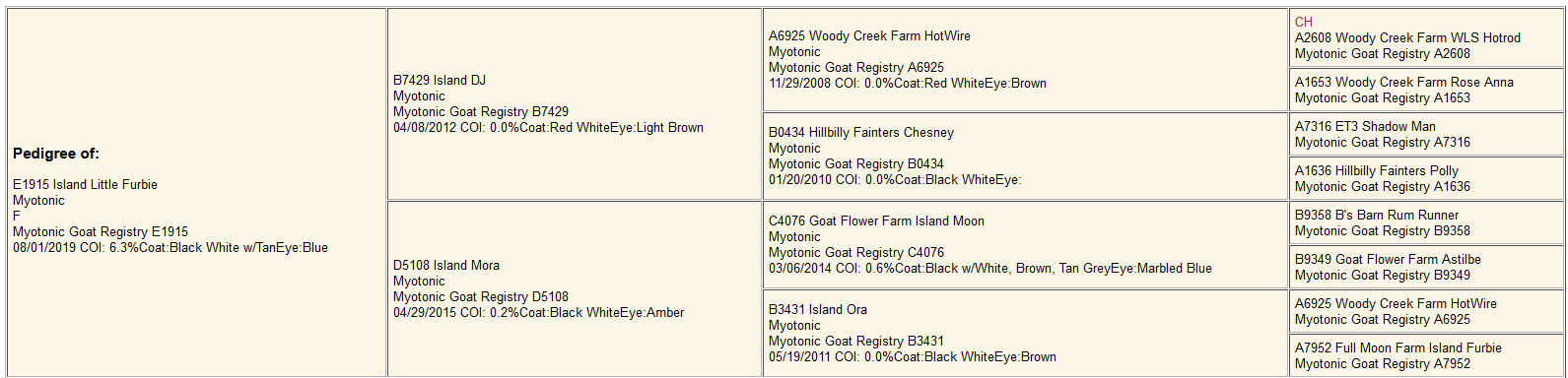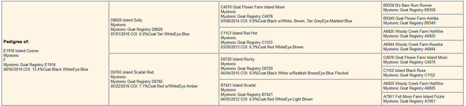 Island Cosmo ISL (Island Sully ISL x Island Scarlet Red ISL) Born: 8-5-2019 - Doe-Polled-Black-Blue eyes Pedigree