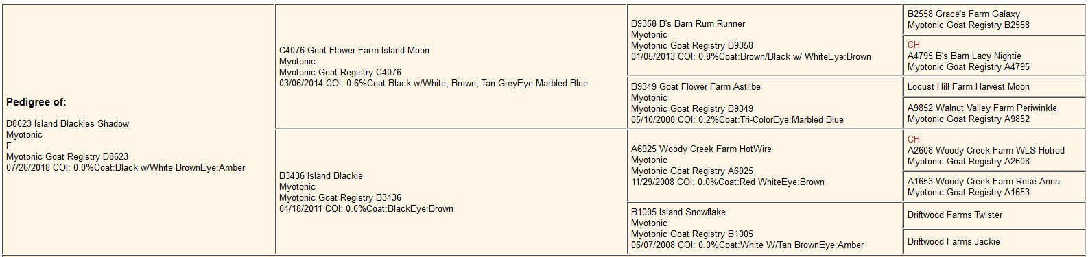 Island Blackies Shadow ISL (GFF Island Moon ISL x Island Blackie ISL) Born: 7-26-2018 - Doe-Disbudded-Black-Moonspot Pedigree