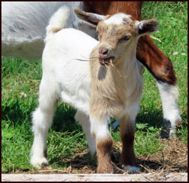 Island Little Lena ISL (Goat Flower Farm Rambo ISL x Goat Flower Farm Island Lily ISL) Born: 6-18-2021-Doe-Disbudded-Tan & White w/Frosted Ears & Nose Pedigree
