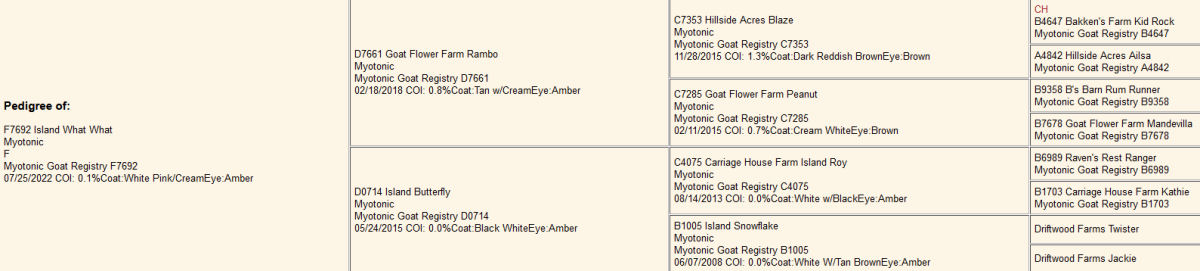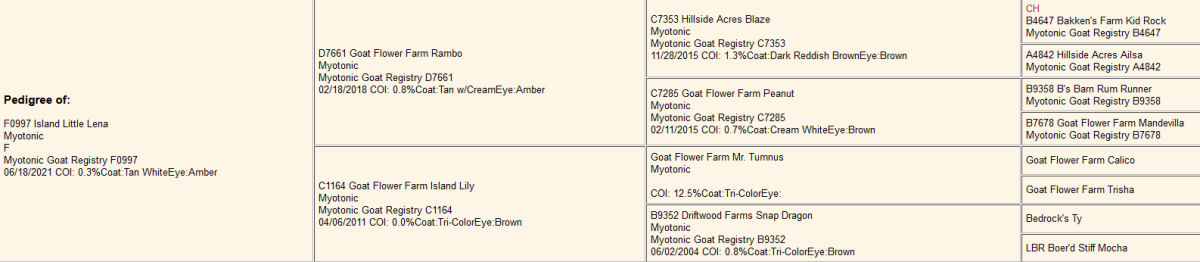 daughter of one of our original two does! Her pedigree is wonderfully old and we can’t wait to see what this pretty girl produces when she has her first litter.
