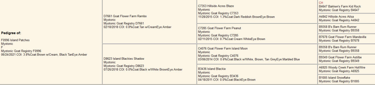 Island Patches ISL (Goat Flower Farm Rambo ISL x Island Blackies Shadow ISL) Born: 6-24-2019-Doe-Disbudded-Brown w/Crème, Black & Tan Moon Spots Pedigree