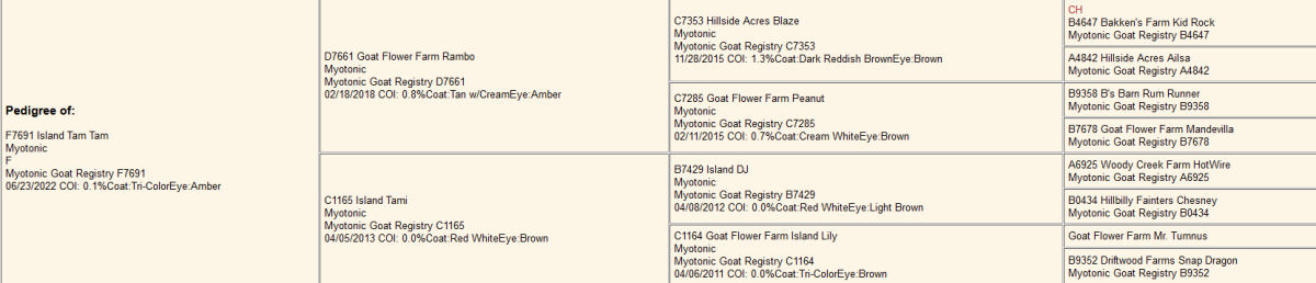 Island Tam Tam ISL (Goat Flower Farm Rambo ISL x Island Tami ISL) Born: 6-21-2022-Doe-Disbudded-Tri-Color Pedigree