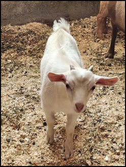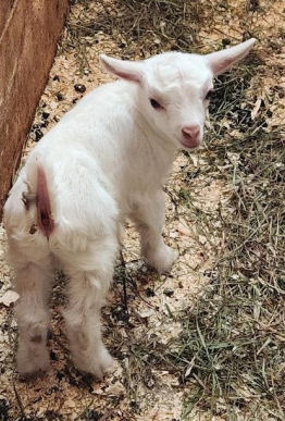 DOB: June 1, 2025 – 1 buck 1 - White/Cream – black facial stripes below his eyes For Sale: Buck-$400/Wethered-$200